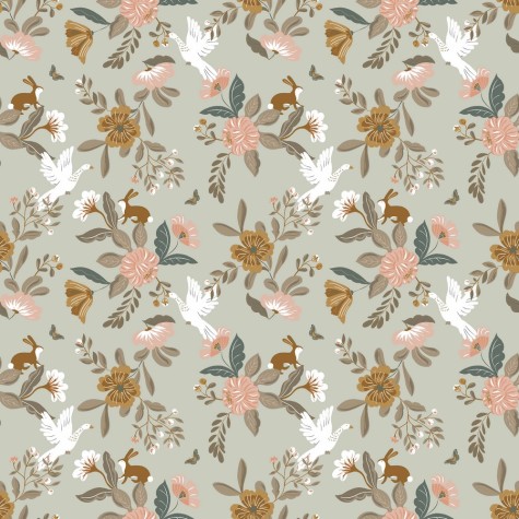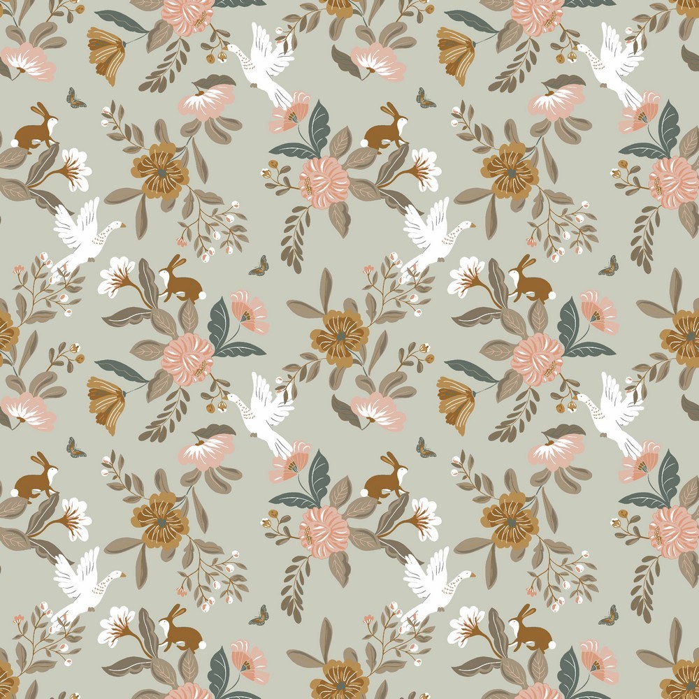 Bio Poplin Stoff – Blumen, Hasen & Gänse auf Beige (GOTS & OEKO-TEX zertifiziert)