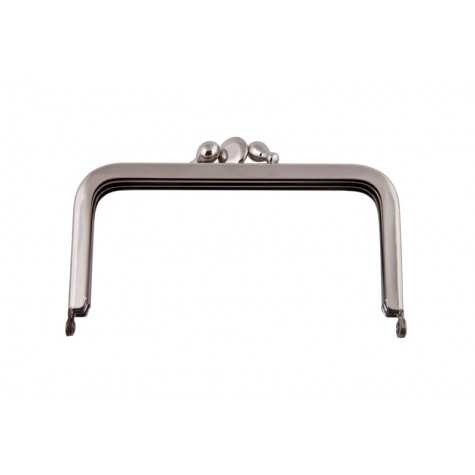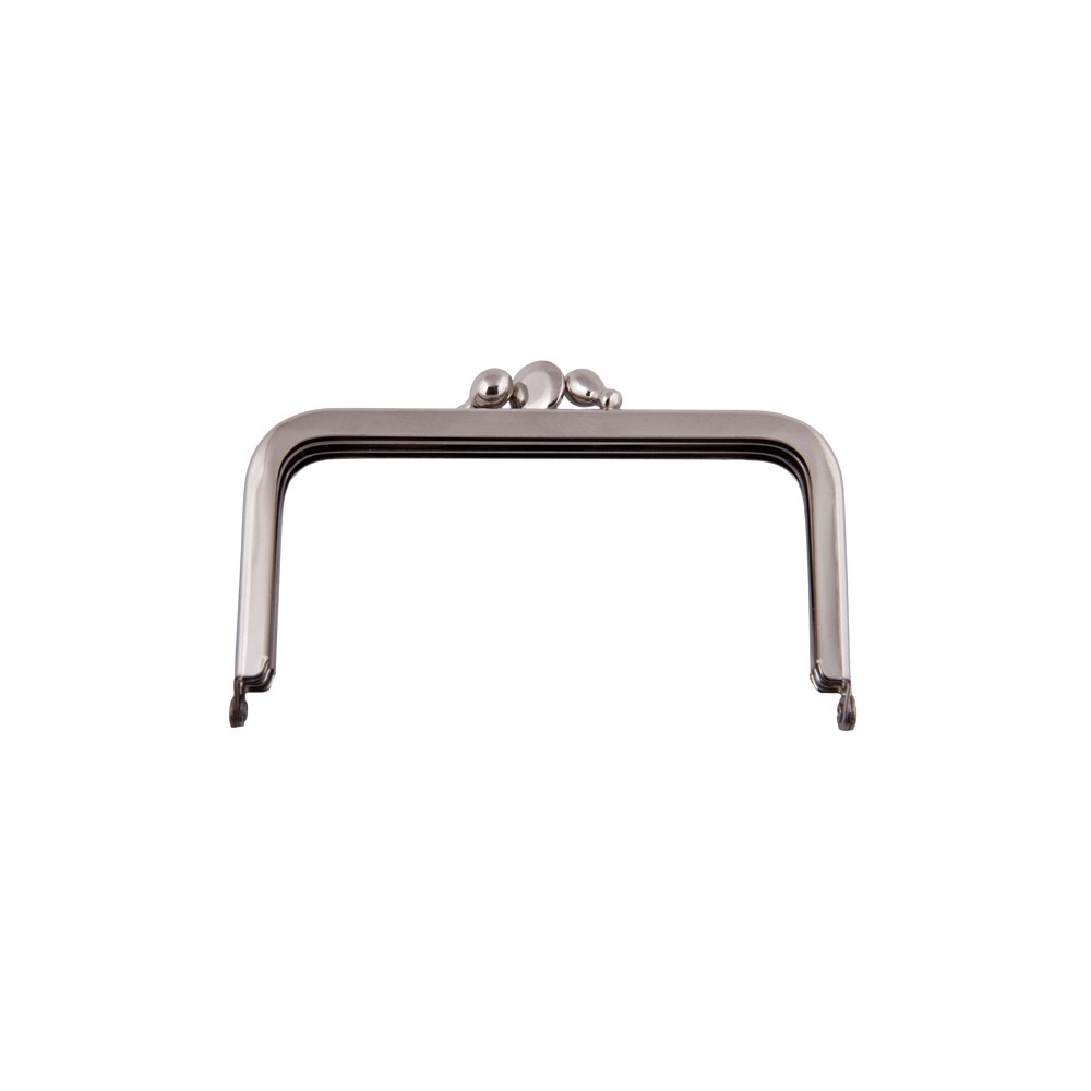 Dieser glänzend vernickelte Taschenbügel besteht aus drei Teilen und bietet somit Platz für zwei Fächer. Er ist gerade geschnitten und eignet sich von der Größe her für ein handliches Portemonnaie. Die Ecken sind leicht abgerundet. Als Verschluss dienen zwei Doppelkugeln an den Außenteilen und eine Linse am Innenteil. Das Material für Geldbeutel, Tasche oder Etui, wie beispielsweise Stoff, Filz oder Leder, wird im Bügel eingeklebt oder mit einer sogenannten Anschlagzange festgedrückt.