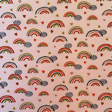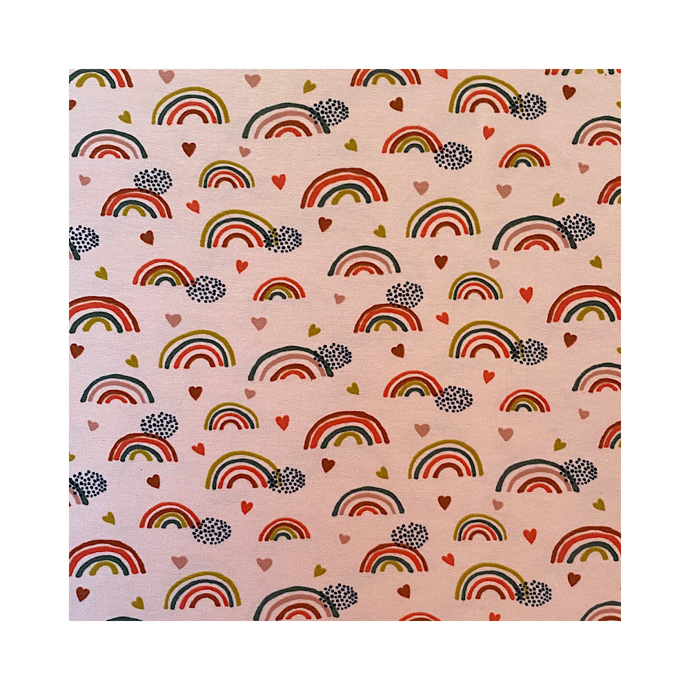 Wunderschöner Baumwolljersey im trendigenRegenbogen Design. Perfekt für das Nähen von Kleidungsstücken wie Hosen, Röcke, Kleider, Beanie Mützen, Hoodies, Leggings Pumphosen, uvm.