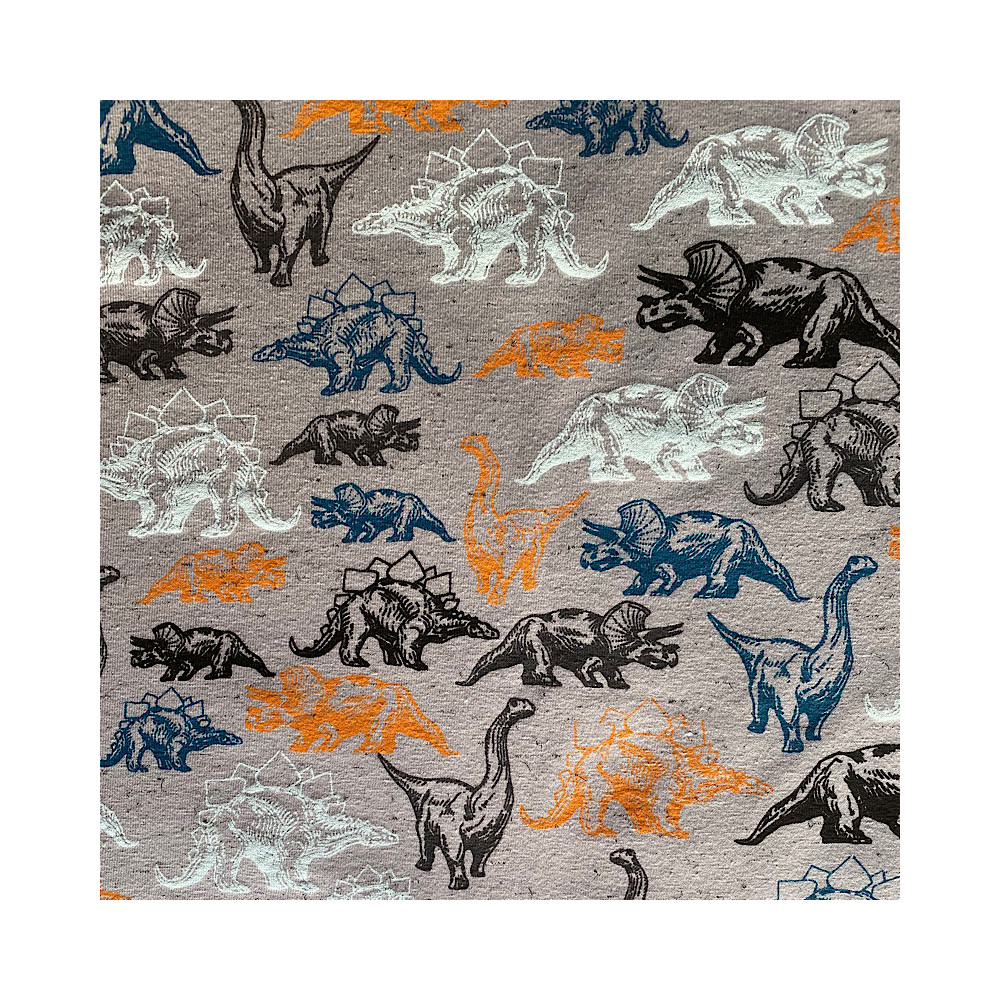 Wunderschöner Baumwolljersey im trendigen T-Rex Design. Perfekt für das Nähen von Kleidungsstücken wie Hosen, Röcke, Kleider, Beanie Mützen, Hoodies, Leggings Pumphosen, uvm.