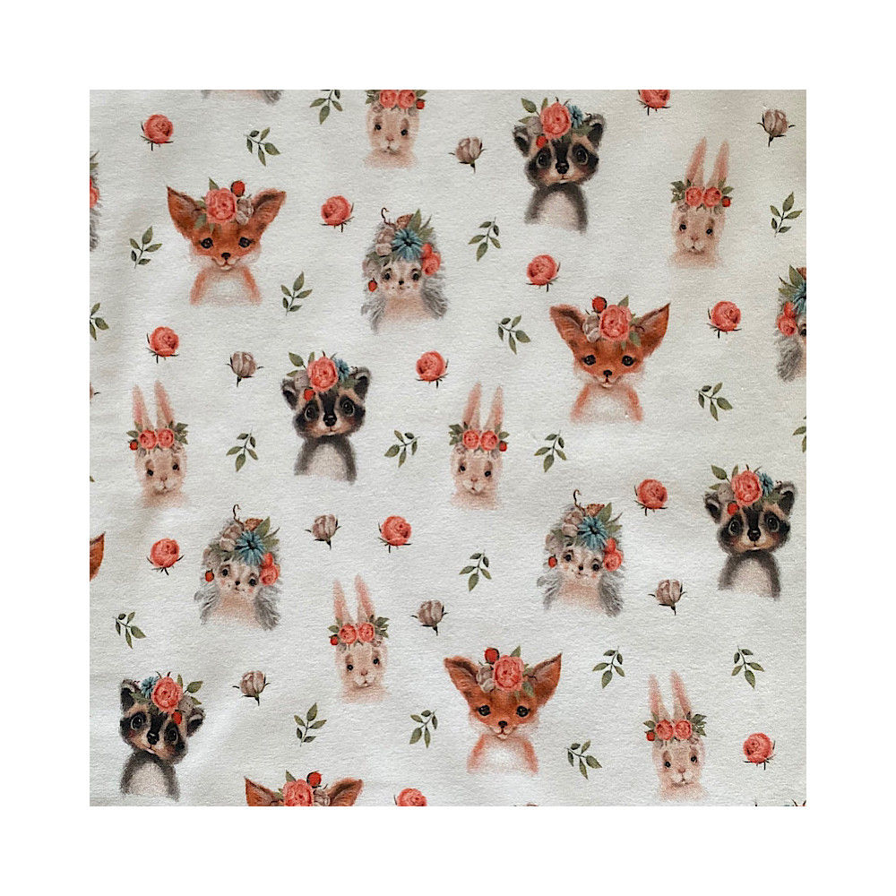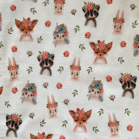 Wunderschöner Baumwolljersey imit Waldtieren. Perfekt für das Nähen von Kleidungsstücken wie Hosen, Röcke, Kleider, Beanie Mützen, Hoodies, Leggings Pumphosen, uvm.