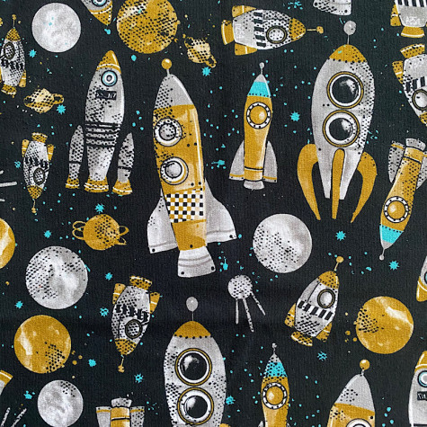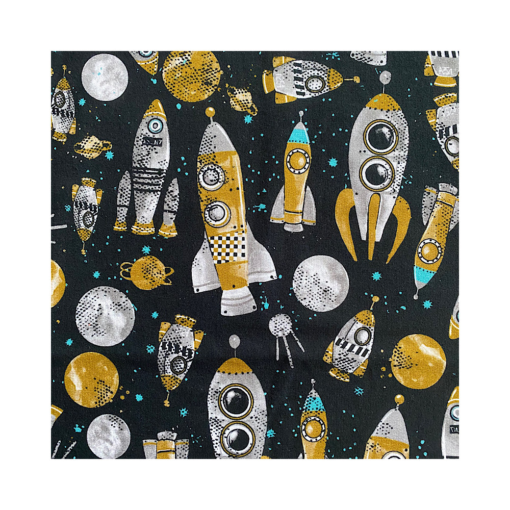 Wunderschöner dicker Baumwolljersey im trendigen Raketendesign. Perfekt für das Nähen von Kleidungsstücken wie Hosen, Röcke, Kleider, Beanie Mützen, Hoodies, Leggings Pumphosen, uvm.