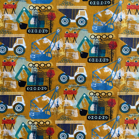 Wunderschöner Baumwolljersey mit Baggern. Perfekt für das Nähen von Kleidungsstücken wie Hosen, Röcke, Kleider, Beanie Mützen, Hoodies, Leggings Pumphosen, uvm.